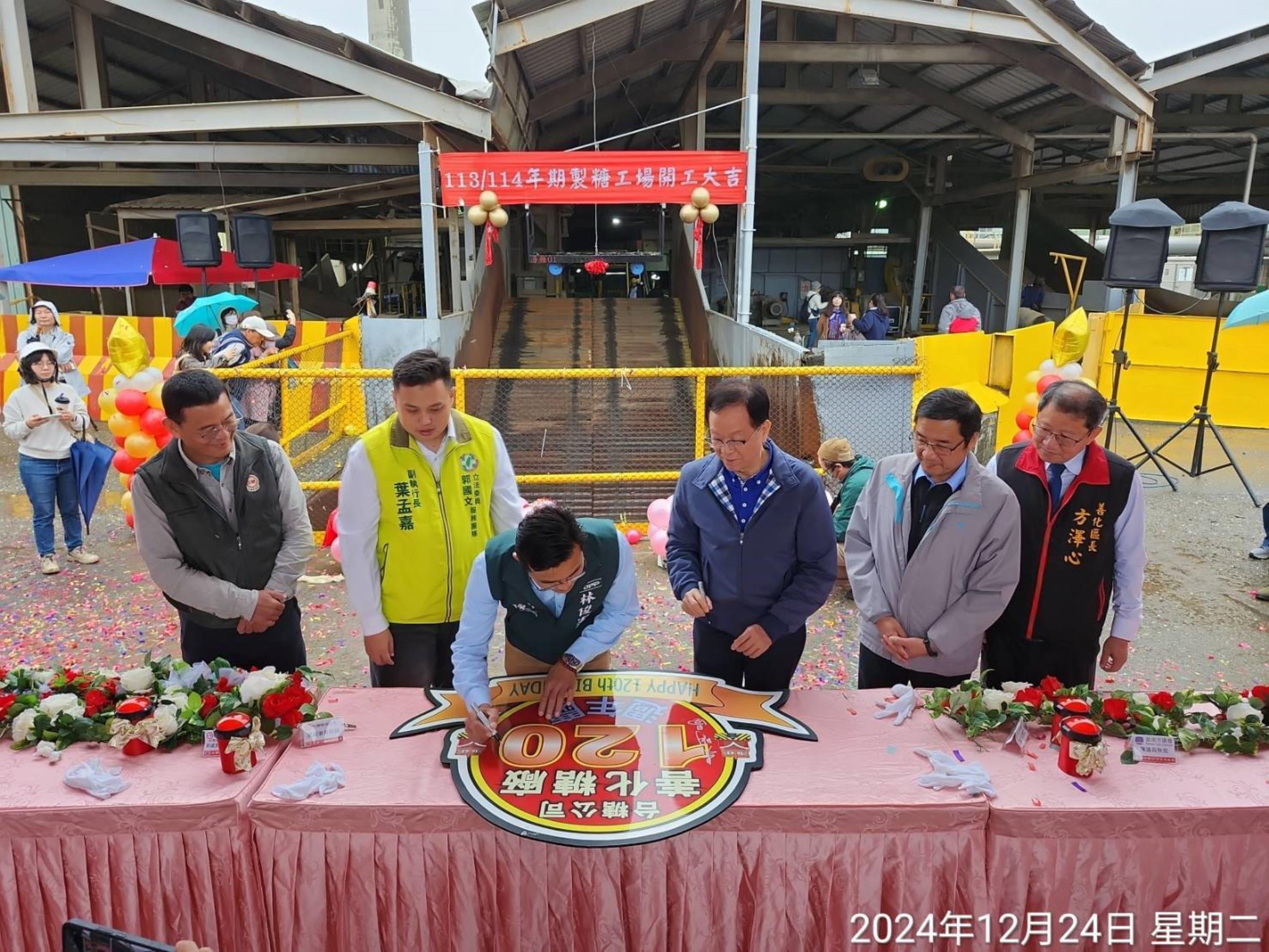 由台糖董事長吳明昌率領糖廠同仁及與會貴賓共同焚香祈禱,並依循傳統「廍動」儀式,將甘蔗拋入壓蔗區,正式啟動製糖期,同時祈求人員出入平安、設備運轉順利,圓滿達成本年期生產目標。