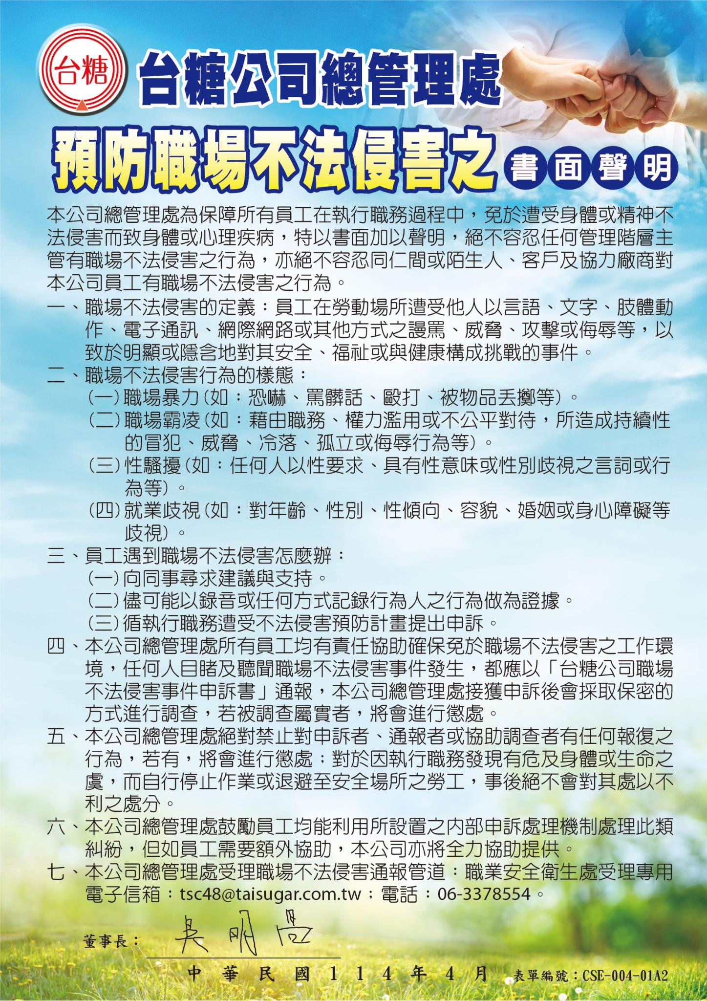 本公司訂有「台灣糖業股份有限公司執行職務遭受不法侵害預防注意事項」,其目的為防止本公司員工執行職務因他人行為遭受身體或精神不法侵害(以下簡稱職場不法侵害),以妥善預防及處置,確保員工之身心健康。