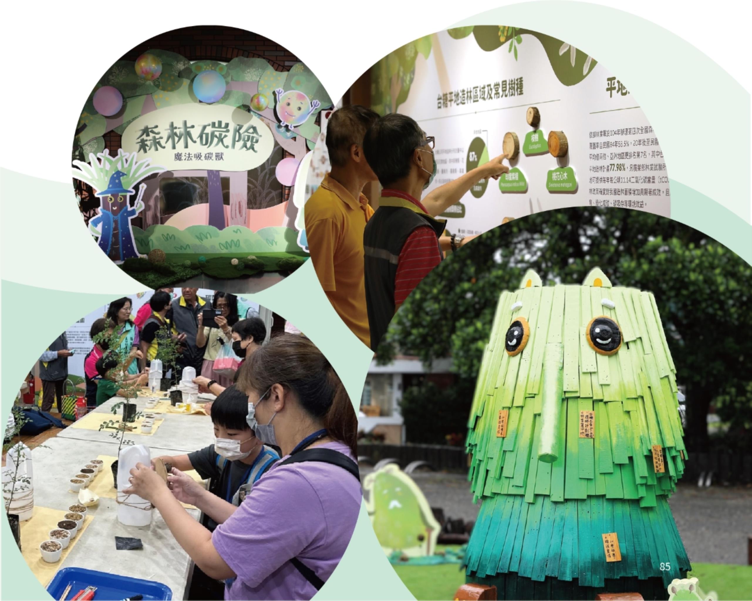 為讓生硬的碳匯知識較為平易近人,台糖碳匯教育館採用故事繪本的形式,創作出多個擬人化的可愛角色,觀展者可隨著「吸碳獸」的腳步,探索森林碳匯展區、影音區、沉浸式森林體驗區及互動體驗區,並可透過視覺、嗅覺及觸覺等多感體驗,一步步展開「碳」險旅程,認識自然碳匯及了解台糖造林的成效。揭幕當天高雄區處也攜手國家環境研究院,於館內舉辦蔗裡有藝樹DIY活動,大小朋友使用回收牛奶瓶做為容器,以台糖甘蔗渣土為基底,栽種台糖造林樹種光臘樹苗,力行循環經濟之餘也為未來臺灣碳中和種下綠色生力軍。