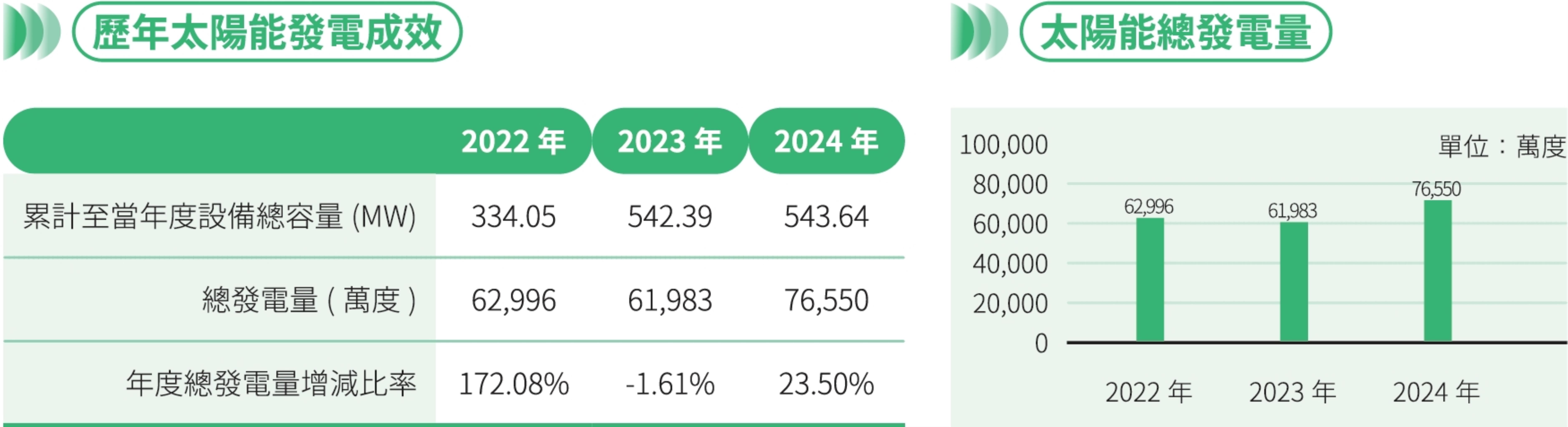 台糖公司過去積極配合政府能源轉型政策,利用公司既有土地資源推動「太陽光電」建置,將盤點之建物屋頂、不適耕作地、停閉廠區閒置用地及滯洪池,經招商程序租予光電業者,設置屋頂型、地面型及水面型太陽能發電設備,以發揮空間使用價值,其中屋頂型及小面積土地的合作模式,則是由廠商建置、維護並出租發電設施予台糖公司加快布建速度。統計2024年度已建置完成太陽光電設施543.64MW,包含屋頂型17.08MW、水面型(滯洪池)99.95MW及地面型(含不適耕作地)426.61MW;另預估2025年新增容量合計8.48MW(視實際情況調整)。