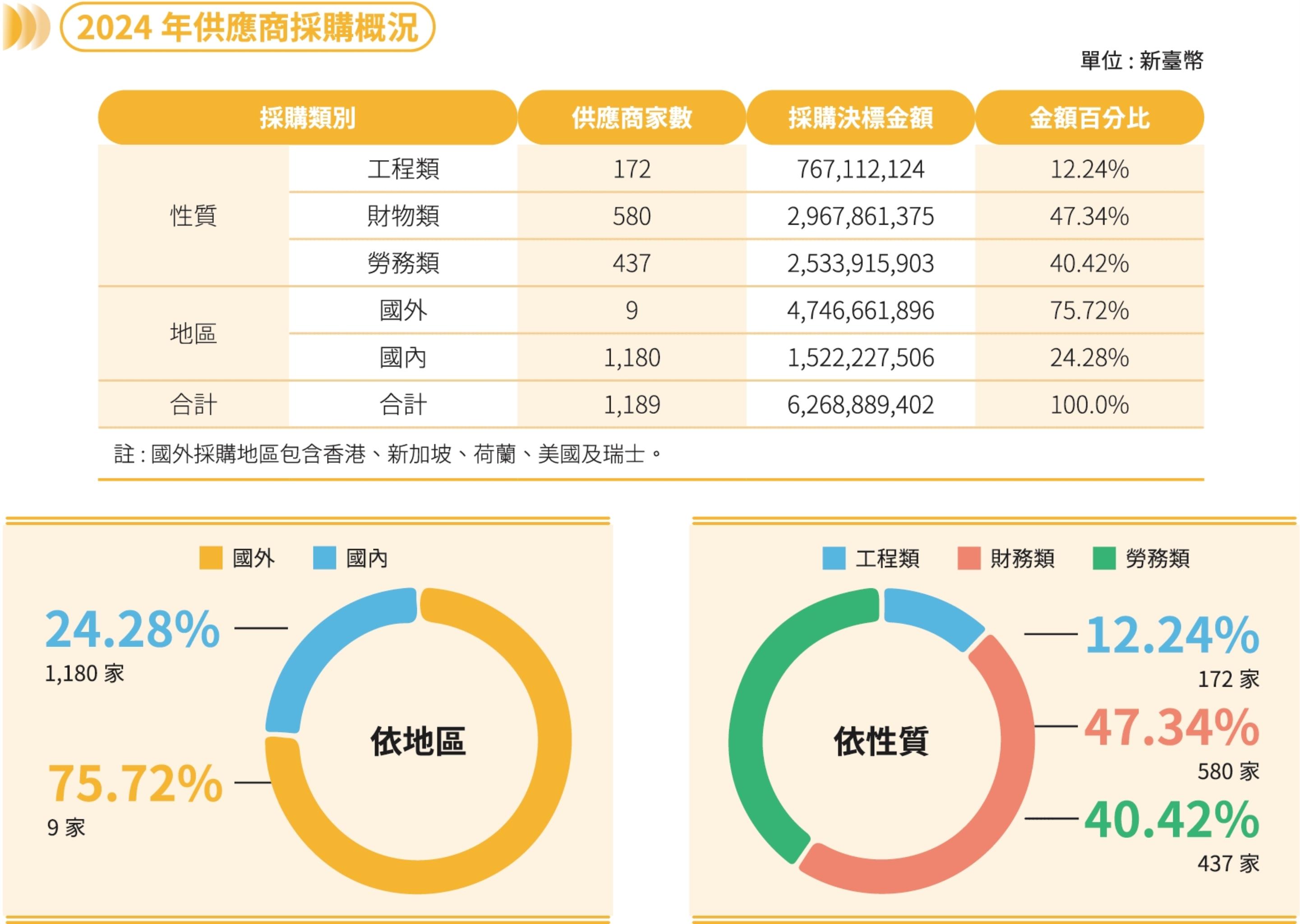 2024年公開之採購總金額(以決標金額計)626.89千萬元,其中進口大宗穀物採購金額為100.94千萬元,原料糖採購金額為373.73千萬元。國外採購金額約占總採購金額75.72%,國內採購金額占總採購金額24.28%。