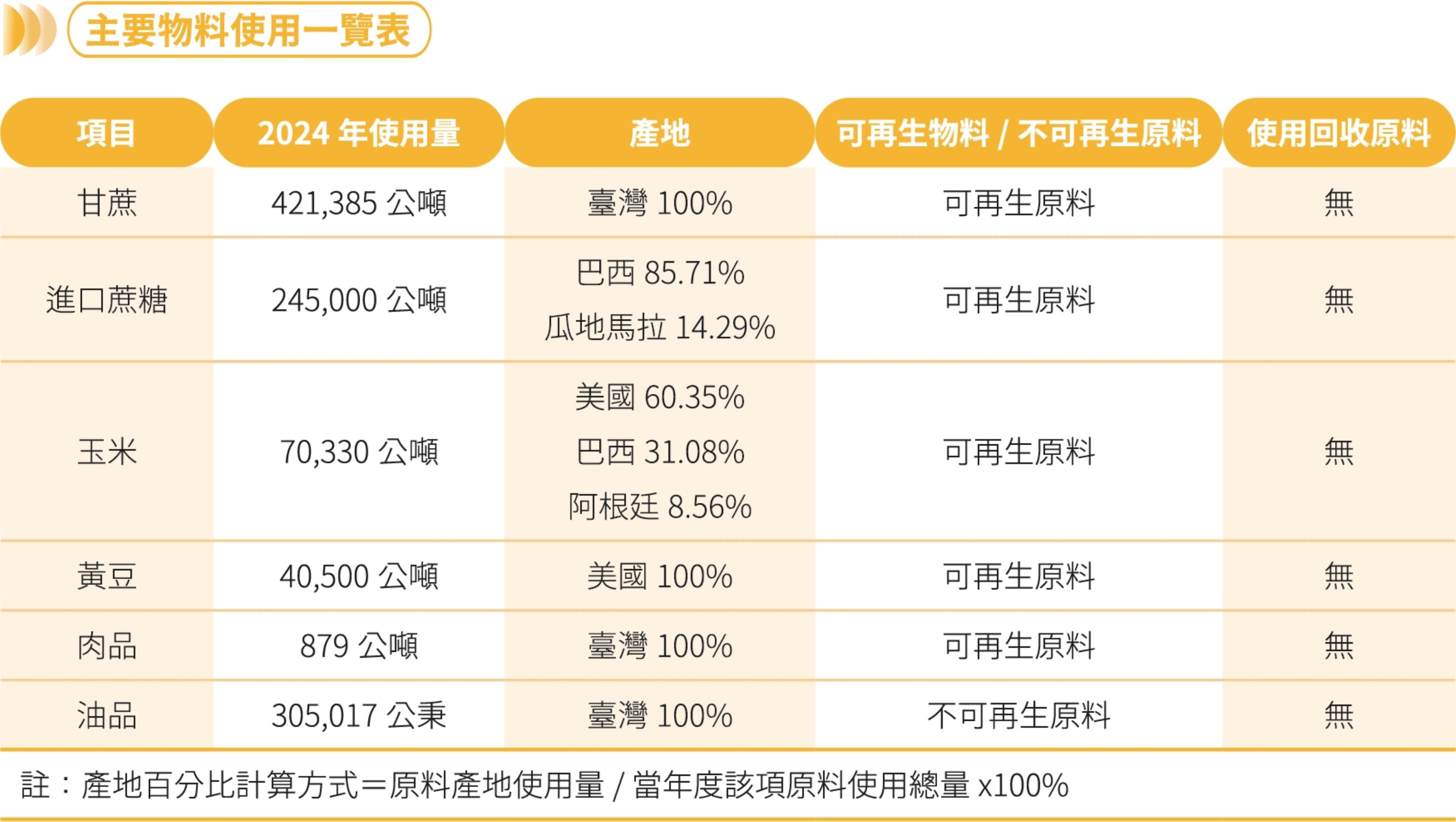 此外,為扶植國內產業,優先考量國內供應商所製造之貨源或提供服務,除了畜殖事業100%大宗穀物原料及砂糖事業全部粗糖原料由國外供應外,其餘均以國內廠商優先供應。