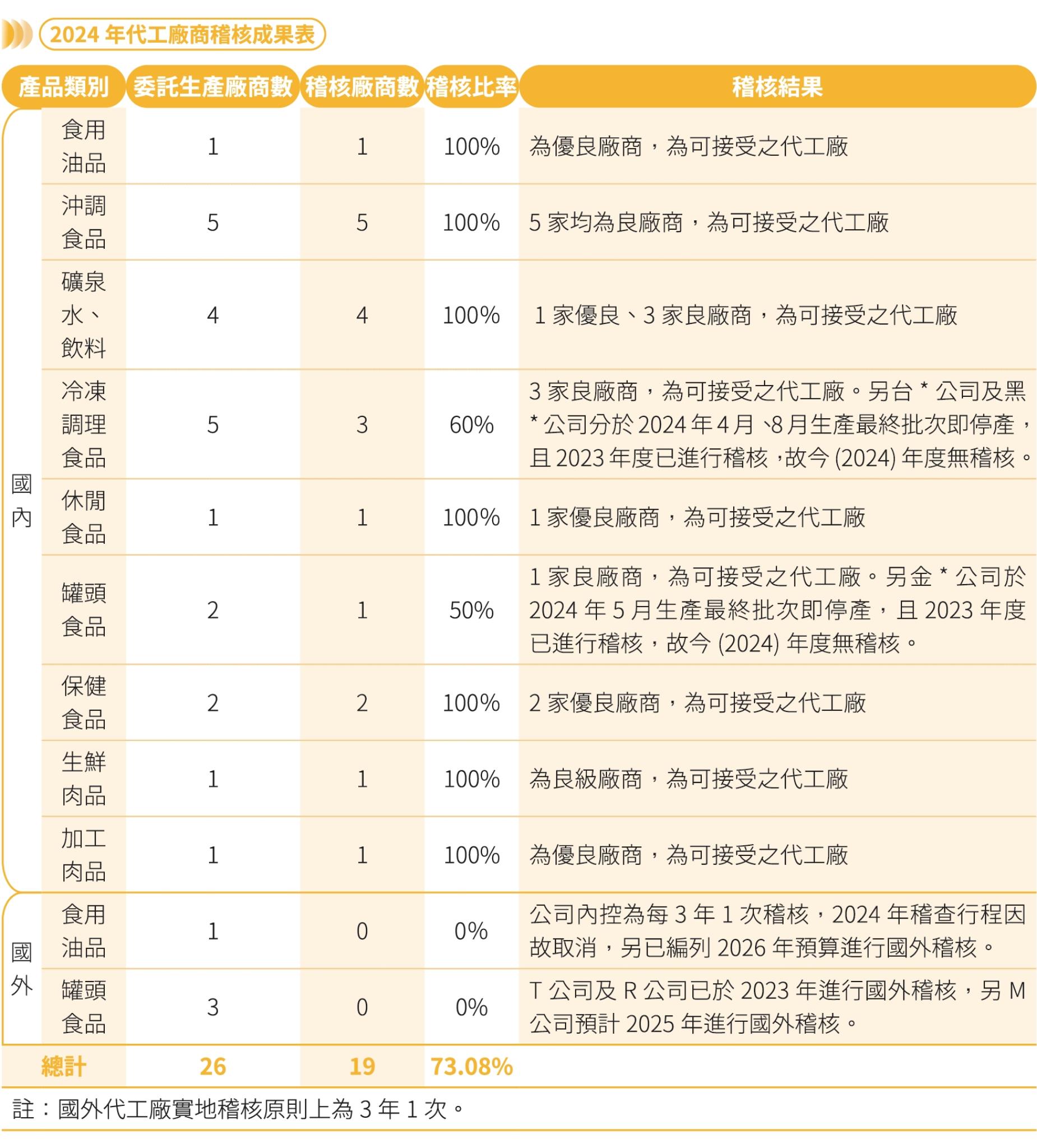 台糖食品為確保品質與安全,對於委外代工食品之品質安全衛生管理,除各單位派員不定期駐廠監製外,另「品質管理委員會」不定期籌組稽查小組至代工生產現場稽查,稽查內容依「委託廠商製造商品品質管理作業要點」中委託製造工廠稽查紀錄表列72項目進行逐項查對,並將稽核結果列入廠商年度續約之考核評分項目之一,考核總分須達80分(含)以上方可續約。