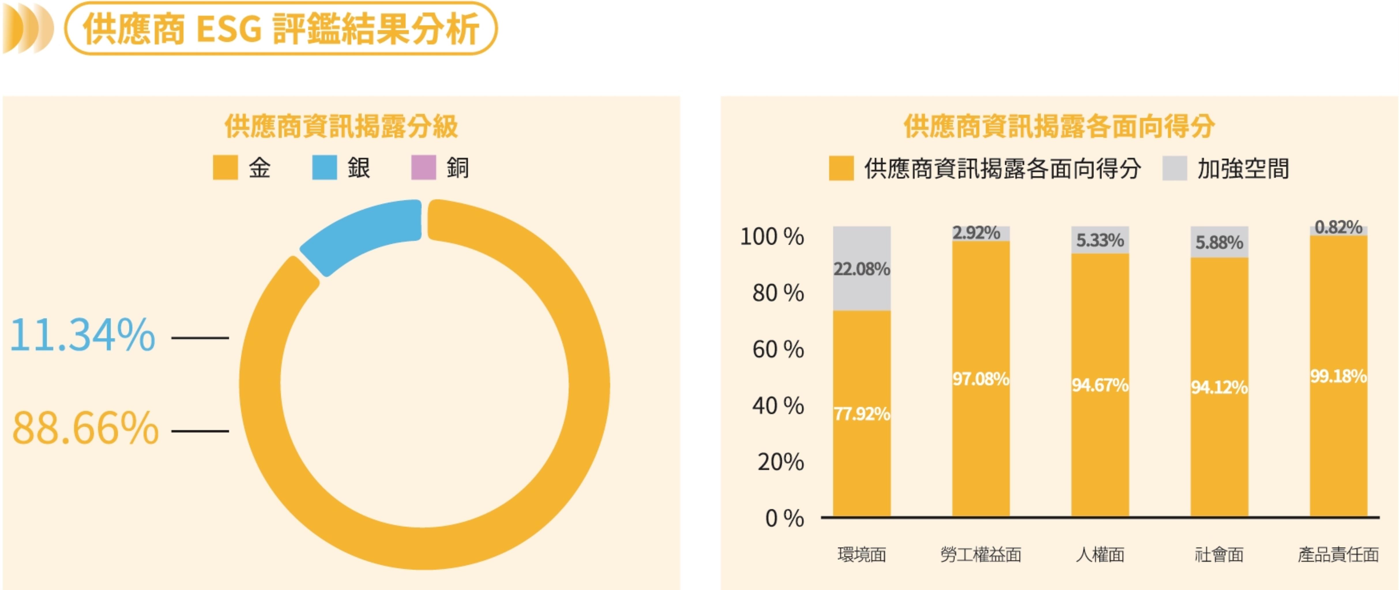 依據供應商自評結果進行分析並將供應商評鑑分數分為金、銀、銅三等級,本次評鑑全數供應商總得分皆超過60分,合格比例達到100%,其中86家更獲得85分以上的金級,占總數88.66%。2024年全數供應商皆無使用童工及限制員工結社自由,另針對5大構面進行分析,上述各面向皆達合格分數以上,僅有環境面的得分較低,原因為台糖於環境面管理要求較高,使供應商於環境面之分數較低,但所有供應商皆符合法規相關規範,未來將參考供應商自評結果,調整問卷內容。供應商問卷評分結果提供各事業單位,做為未來採購參考,並持續推動各類別供應商符合企業社會責任之5大構面的評核,提升供應商夥伴對ESG的落實與管理。