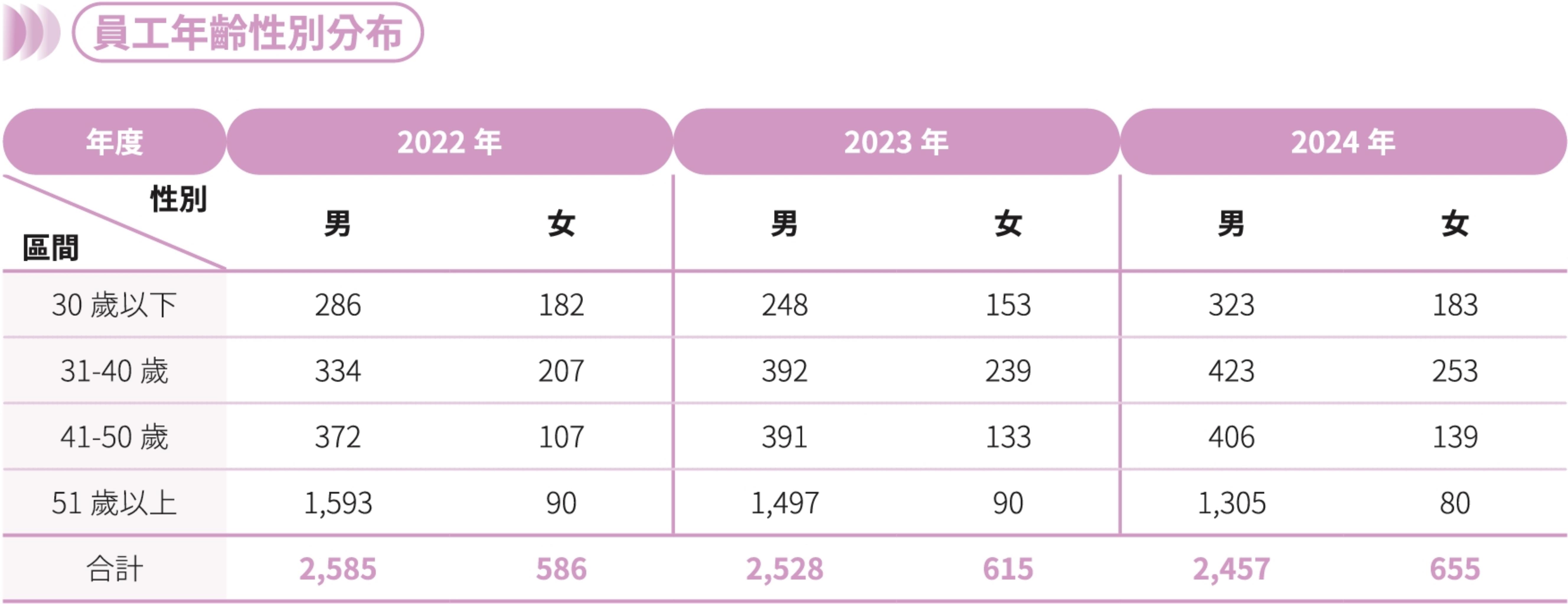 為保障弱勢及相關族群平等就業機會,在身心障礙者及原住民等僱用上,均達成「身心障礙者權益保障法」及「原住民族工作權保障法」之相關規定。截止至2024年年底,公司任用的原住民24名、身心障礙者113名,均符合法律進用規定,2024年無侵犯原住民權益事件及相關情事。