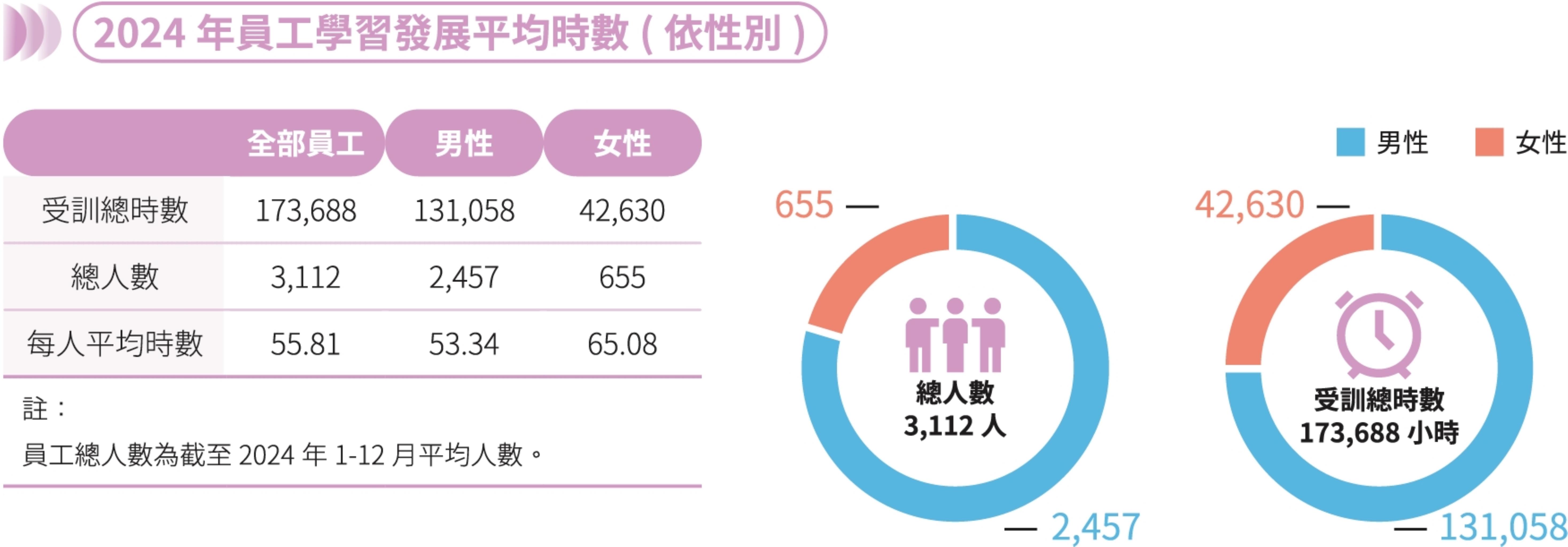 2024年培訓3,112人(1-12月平均人數),合計173,688小時,平均每人訓練時數(含實體及線上)為55.81小時,較2023年(平均48.75小時)增加7.06小時,員工訓練費用共支出3,559萬1,268元。