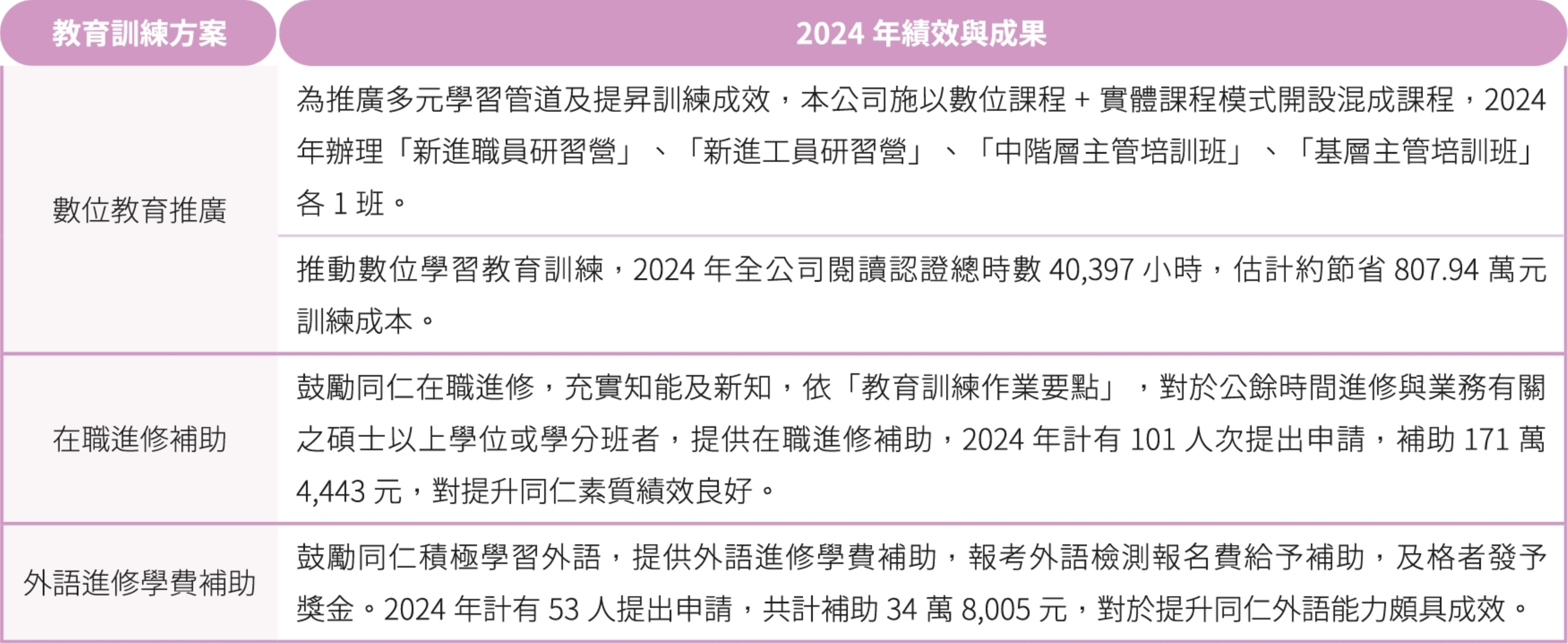 公司提供定期且完善的訓練資源與學習環境,並訂有「教育訓練作業要點」,包含由公司統籌辦理之共通性統籌訓練、各單位依個別業務需要辦理之自辦訓練、參加外界訓練、在職進修、知識分享活動及數位學習課程等。針對新進人員,則依照分類、評價職位及業務性質不同,施予短期的講習或較長期的養成訓練,並就其能力條件與個人志趣派任工作;在職人員方面,為使其不斷地增加專業知識與管理技能,釐訂各項在職訓練方案,以增強核心技術能力、培育新知識與新技能,塑造更和諧的工作環境和良好的企業文化。以紮實穩固的教育訓練系統,讓員工的成長與學習更具效率,塑造一個有價值、有競爭力的公司品牌。