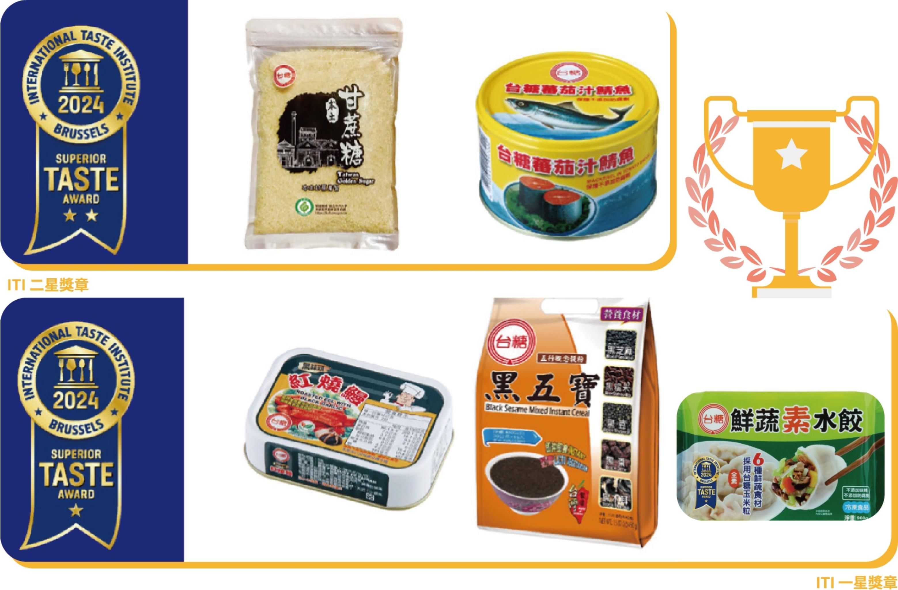 台糖2024年以新秀之姿參加ITI舉辦的風味絕佳奬評鑑,成功征服來自全球各地專業廚師及專家的味蕾,首度參賽即全數獲獎,五項熱銷食品共摘下7星之肯定,包含「本土甘蔗糖」(2星)、「蕃茄汁鯖魚」(黃罐)(2星)、「黑蒜頭紅燒鰻」(1星)、「黑五寶」(1星)及「台糖鮮蔬素水餃」(1星)。