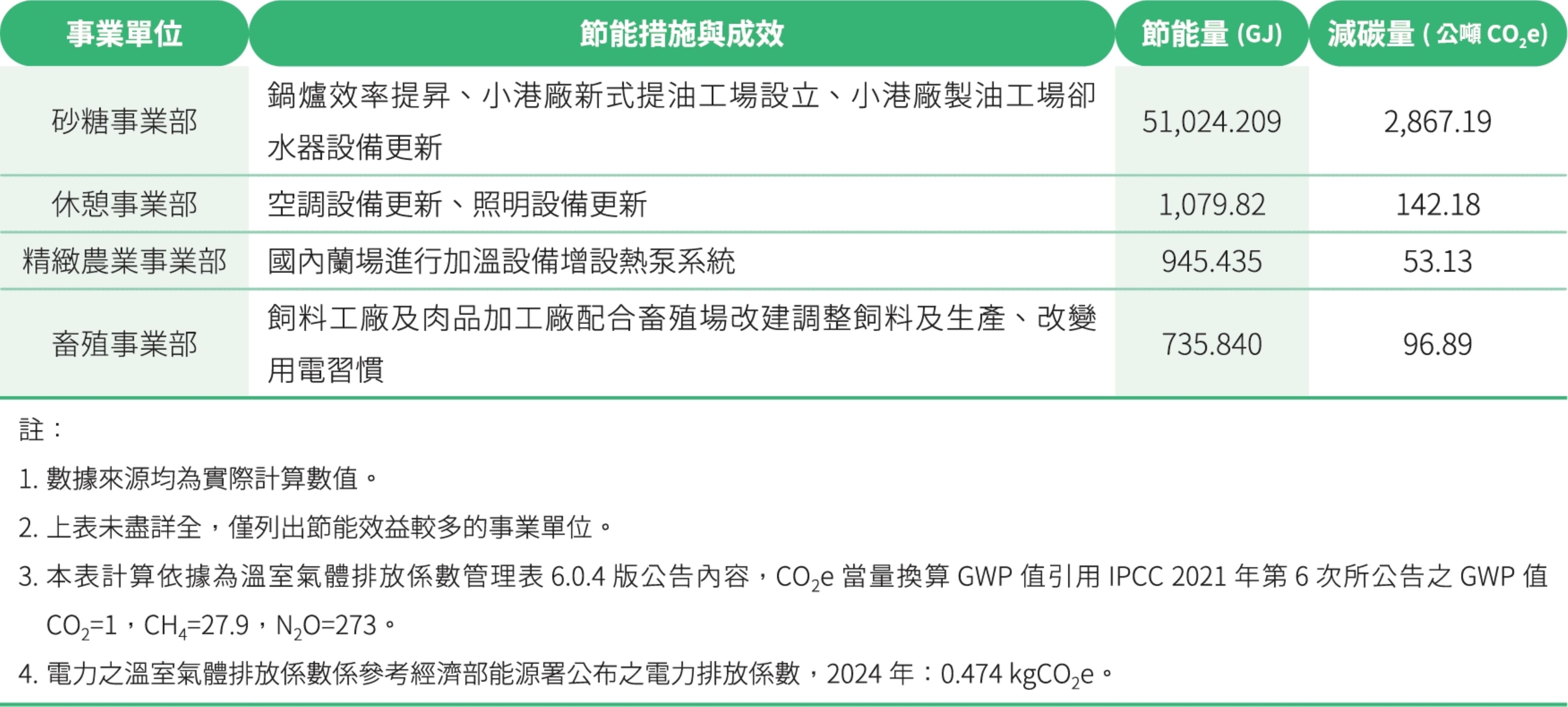 為有效落實節能減碳政策,本公司對於非排碳大戶之休憩、商銷、精農、生技、油品事業部及幕僚單位,則透過更換既有能源效率低之設備(電燈、冰水主機及空調設備汰換更新等),採用能源效率高之設備及公務車輛逐步電動化,搭配推動節約能源運動,以減少排碳量。統計2024年各單位節電、節能(含固定源及移動源)換算總節能量約56,587.824GJ,減碳約3,517.24公噸CO2e。