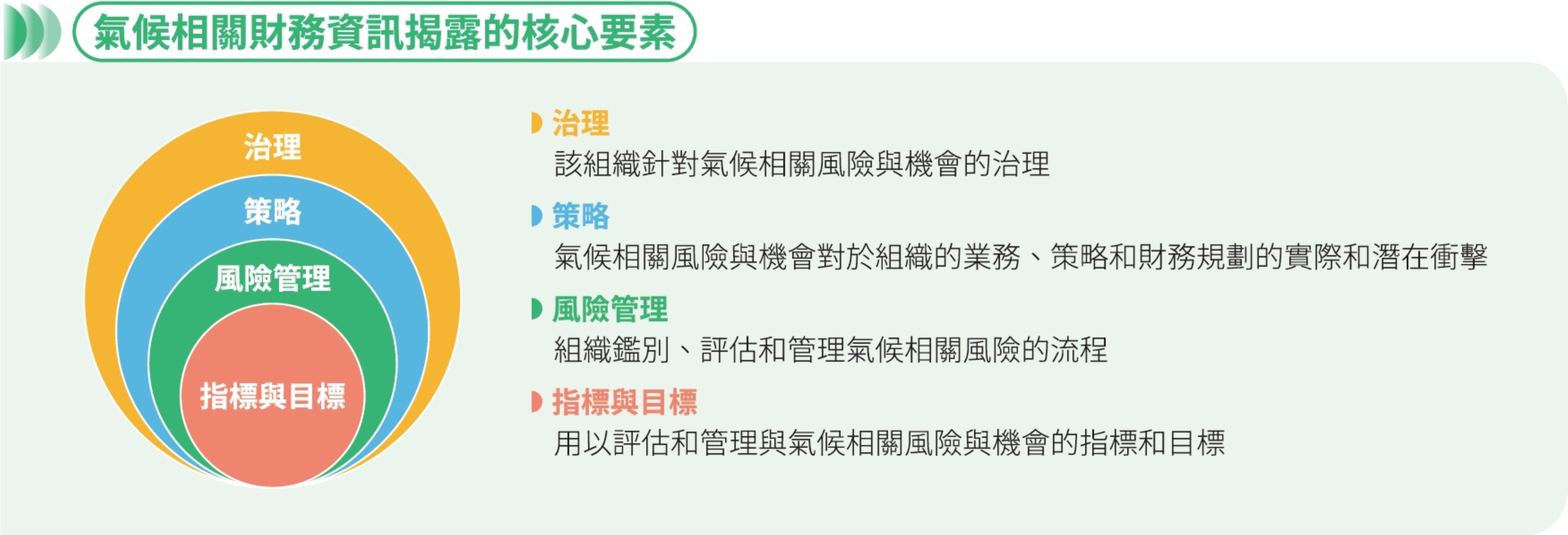 為配合政府2050淨零排放政策,2022年本公司啟動「台糖公司淨零轉型之策略評估與建議」研究計畫,從政策、法規、技術可行性的角度,盤點台糖淨零排放路徑之資源;亦參考國際金融穩定委員會(Financial Stability Board, FSB) 發布之「氣候相關財務揭露建議書 (Task Force on Climate-Related Financial Disclosures, TCFD)」,依其資訊揭露四項核心要素:「治理」、「策略」、「風險管理」及「指標與目標」,建立氣候變遷治理架構,鑑別可能對營運造成重大性影響之風險與機會,提出其相關應對策略,訂定可持續管理之氣候相關指標與目標。