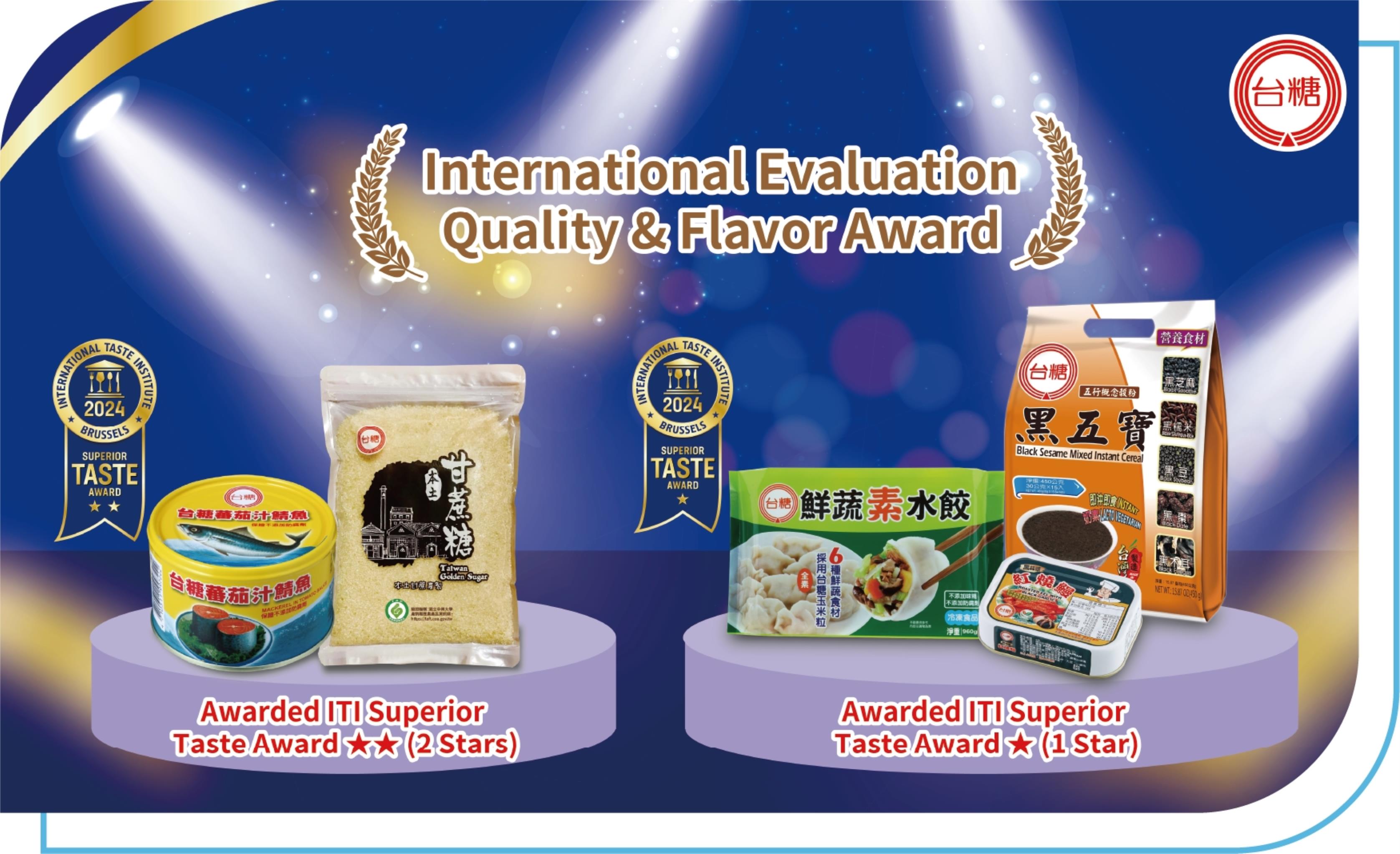 Taiwan Golden Sugar and Mackerel in Tomato Sauce (Yellow can) were honored with Excellent Flavor Two-Star Medal while Roasted Eel with Black Garlic, Black Sesame Mixed Instant Cereal, and Taisugar Fresh Vegetable Dumplings were honored with Excellent Flavor One-Star Medal of the Superior Taste Award of the International Taste Institute (ITI).