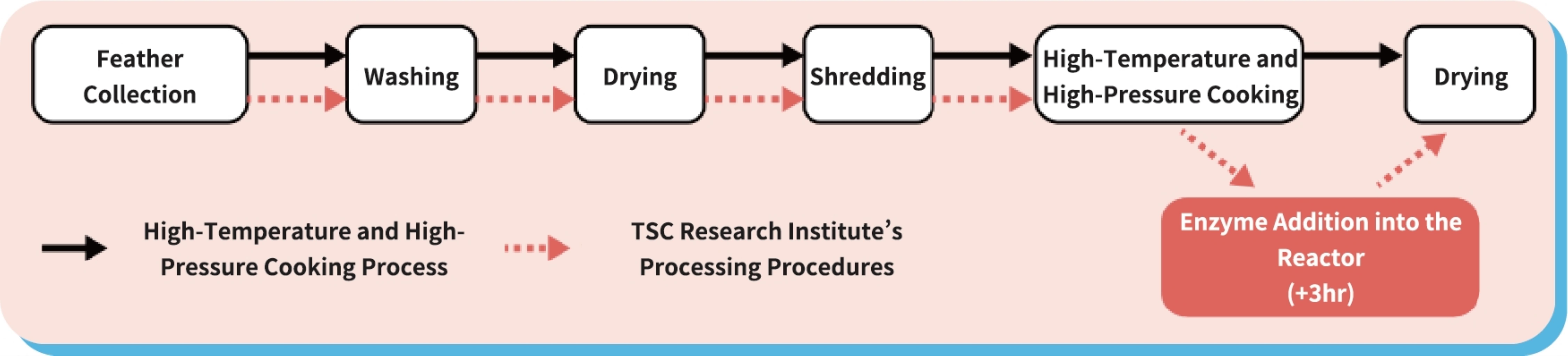 Taiwan Sugar Research Institute (TSRI) has found the pain point of this value chain. Without altering the existing industrial chain and the existing equipment of the processing plant, the addition of a single, simple reaction step incorporating specialized microorganisms can increase the digestion efficiency by over 85%, completely changing the quality and appearance of feather meal, and creating a new industrial value chain. Animal experiments have confirmed that in aquatic applications, it can be used as a growth promoter and replace 10 to 30% of fish meal protein; in the application of young livestock and poultry, it can be used as a high-quality protein and replace 20 to 50% of fermented soybean powder and fish meal protein. It is initially estimated that this technology can increase the output value of this industry in Taiwan by about 6.7 times, reaching NTD2.8 billion.