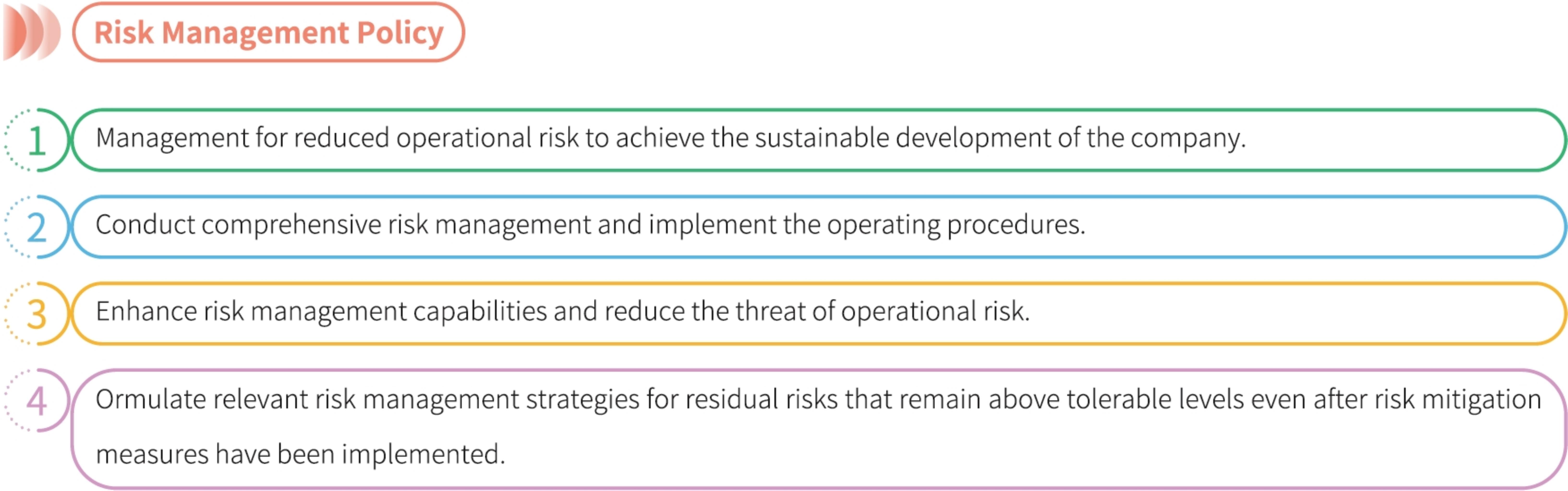 Risk management is an important part of the sustainable management of an enterprise. To manage the risks faced by each unit of our company's operations and reduce losses caused by risks, we have established the “The Key Points for Risk Assessment and Management.” Its contents encompass risk management policies, the establishment of Taiwan Sugar Corporation Risk Management Promotion Committee, Internal operational procedures and public opinion as reflected in the media and press coverage. The annual evaluation and management of potential risks by each unit based on its operating environment and industry changes. This includes the identification and management mechanisms of various potential risks such as natural disasters and the supply and safety of raw materials for major products like sugar and feed. We will continue to optimize our risk management mechanisms to create a high-quality operational environment, minimize or avoid the occurrence of risks, and achieve our corporate sustainability goals.
