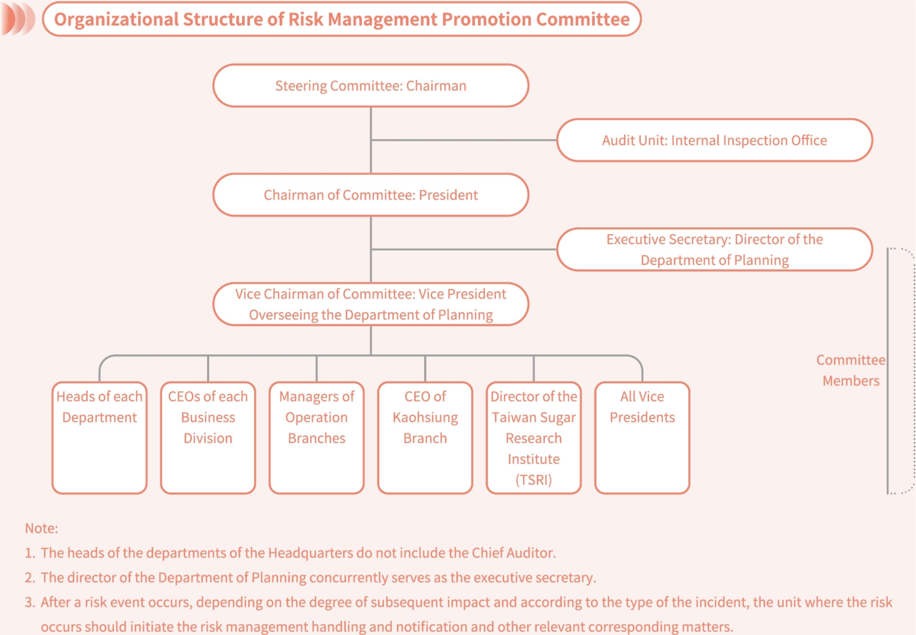 To implement and assist each unit with the promotion of risk management operations, TSC established the Risk Management Promotion Committee, with the chairman serving as the steering committee, the president as the chairman of the committee, the vice president of the Business of the Department of Planning as the vice chairman, and all the vice presidents, the first-level supervisors of all departments (excluding the Internal Inspection Office) as the committee members. Additionally, a certain number of consultants or expert scholars may be hired when necessary.