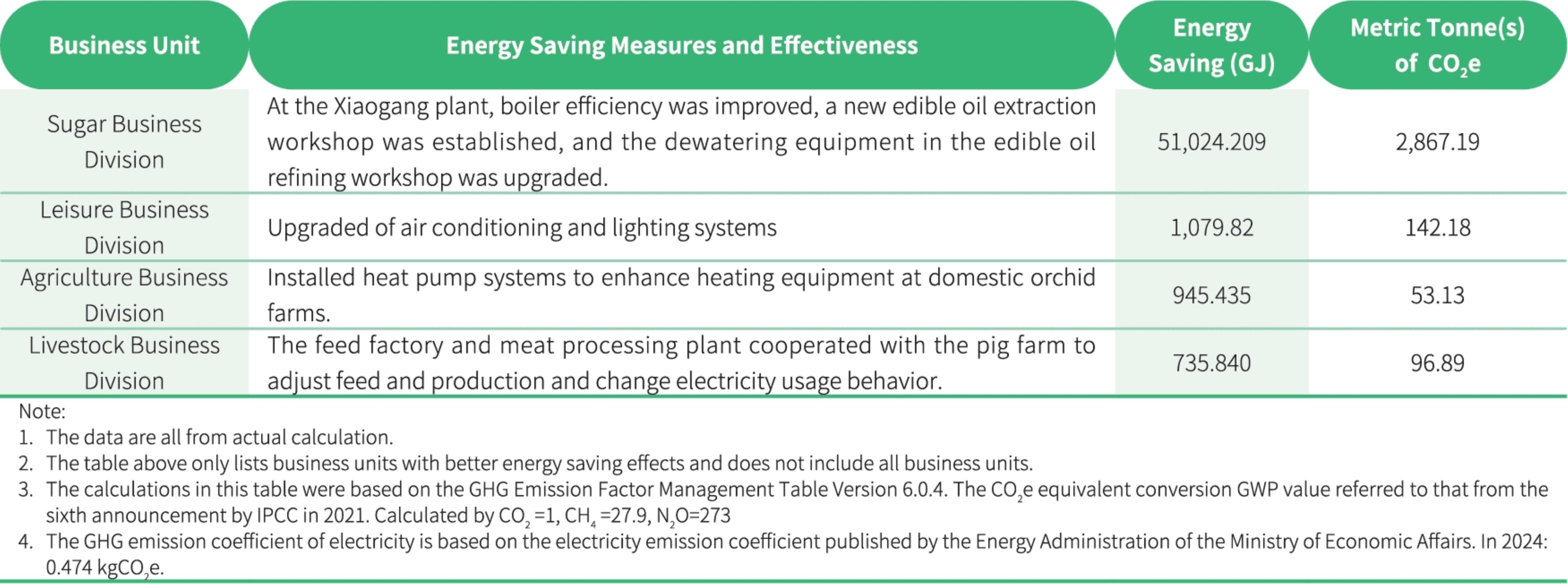 To effectively implement the energy conservation and carbon reduction policy, TSC replaced existing low-energy-efficiency equipment (such as lights, chiller units, and air-conditioning equipment) for the Leisure, Marketing, Agriculture, Biotechnology, and Petroleum Business Divisions and staff units that are not major carbon emitters, adopted high-energy-efficient equipment and gradually phased electrification of official vehicles, and promoted energy conservation to reduce carbon emissions. Statistics show that in 2024, the total energy savings (including fixed and mobile sources) of each unit amounted to approximately 56,587.824GJ, reducing approximately 3,517.24 metric tonnes of CO2e