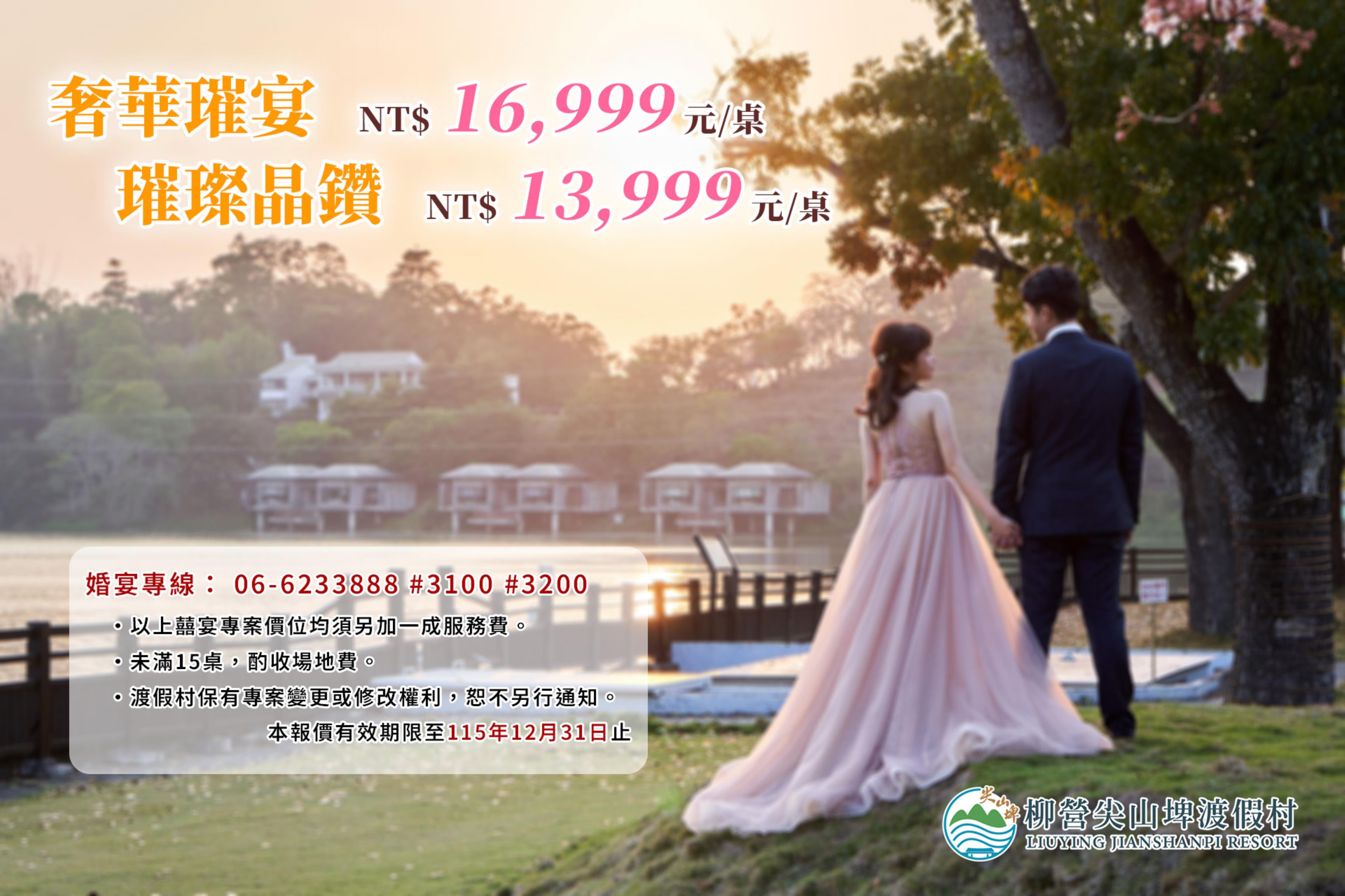 以上喜宴專案價位均須另加一成服務費 洽詢電話:請洽餐飲部 06-6233888分機3100或3200 本渡假村保有專案變更或修改權利恕不另行通知