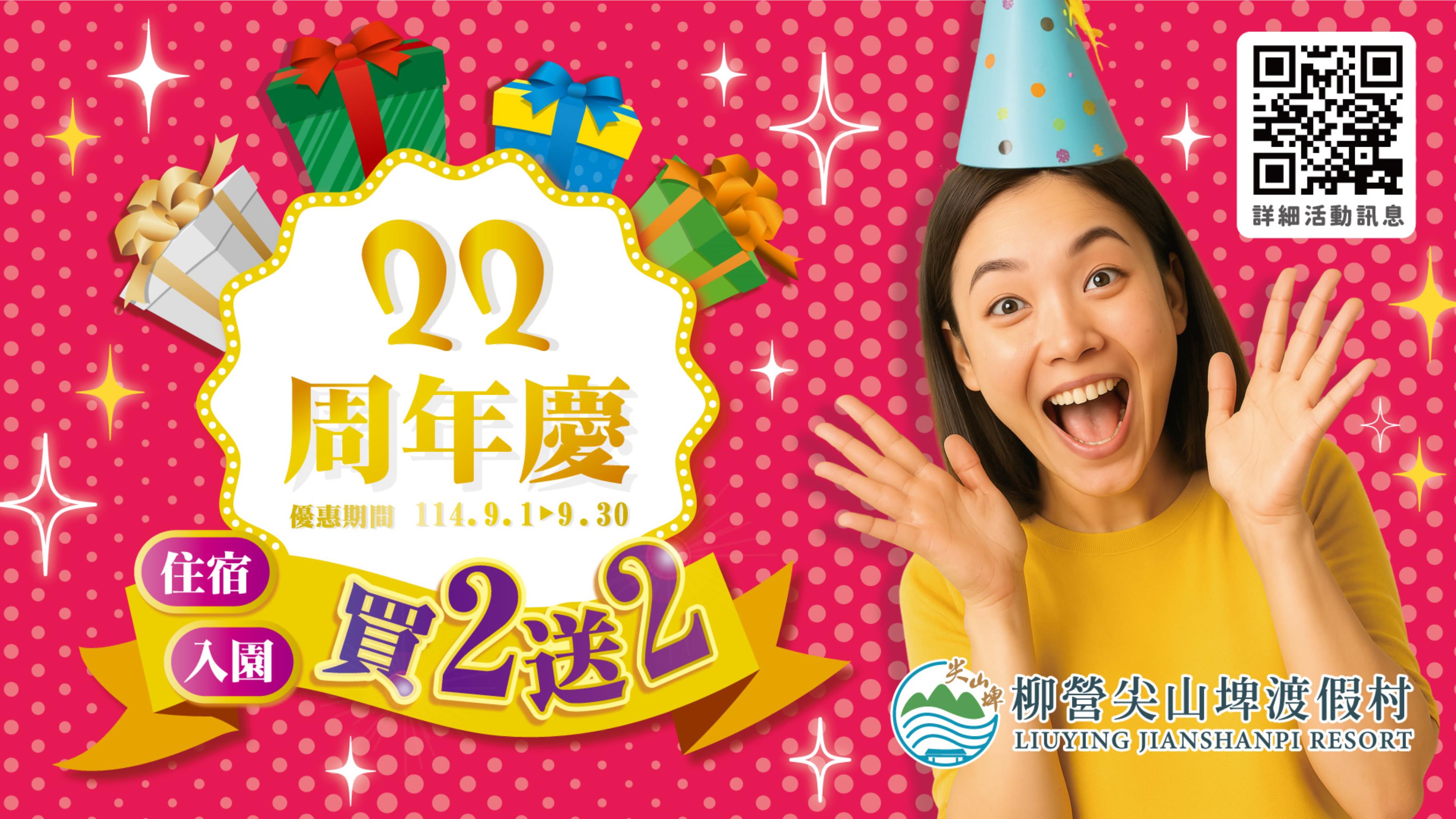 柳營尖山埤渡假村歡慶22週年囉!為感謝顧客長期支持與愛護,尖山埤渡假村自9/1至9/30止舉辦22週年慶系列活動,推出「秋香龍眼-親子食農生態探索」、「住宿入園買2送2」、「訂餐免收服務費」、「醫護軍警消及教師優惠」等多項優惠。